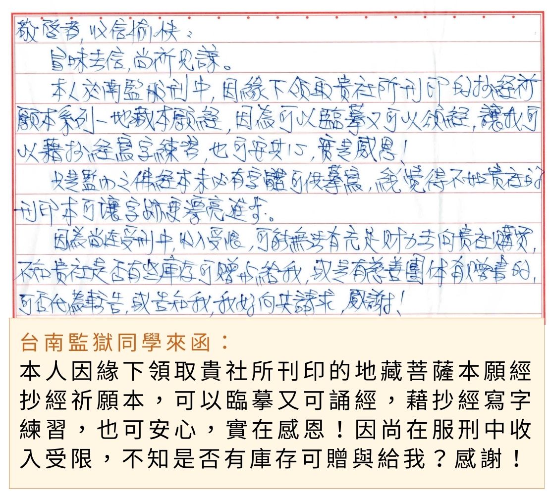 監獄同學來函:本人因緣下領取貴社所刊印的地藏菩薩本願經抄經祈願本, 可以臨摹又可誦經,藉抄經寫字練習,也可安心,實在感恩!