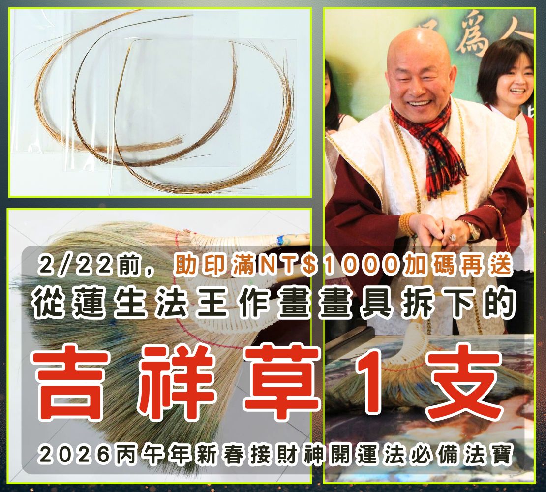 2/22前,助印滿NT$1,000,就送馬年迎財神必備法寶~從蓮生法王作畫畫具拆下的吉祥草一支!