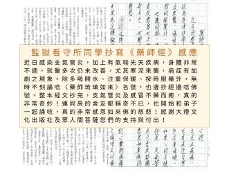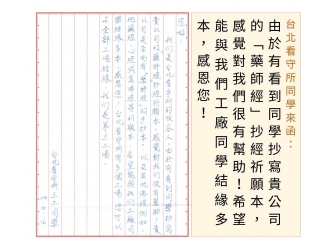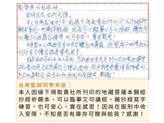 監獄同學來函:本人因緣下領取貴社所刊印的地藏菩薩本願經抄經祈願本, 可以臨摹又可誦經,藉抄經寫字練習,也可安心,實在感恩!