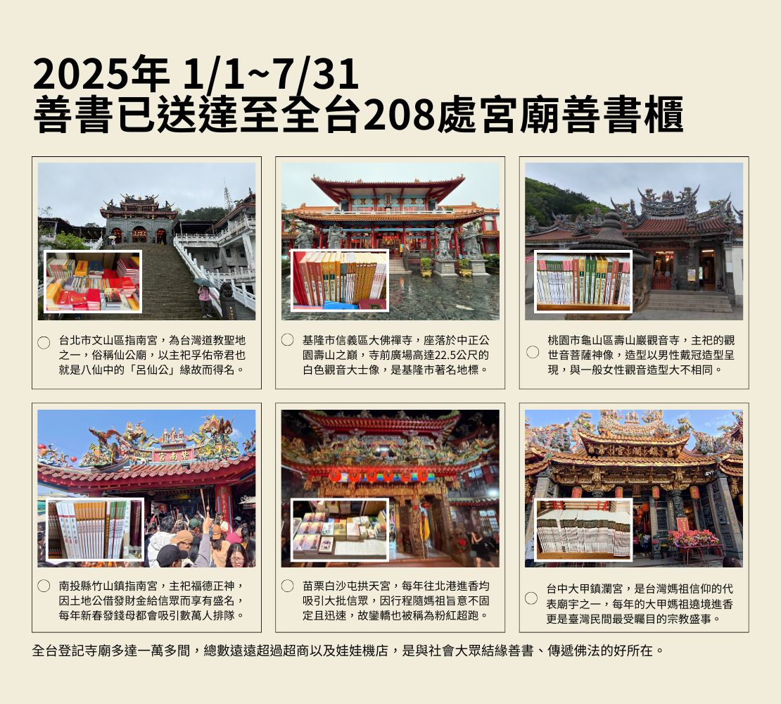 截至7/31為止,今年度的「請佛住世」善書流通活動,已送達至全台208處宮廟善書櫃!