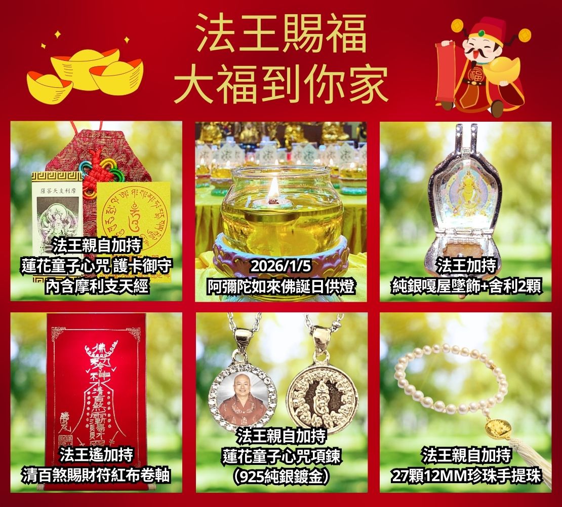 註1:除NT$2,000元滿額贈品「2026年1月5日阿彌陀如來佛誕佛前供燈一天」可累送外,其餘贈品恕不累送,送完改送等值贈品;台灣地區免運費,海外地區運費另計。