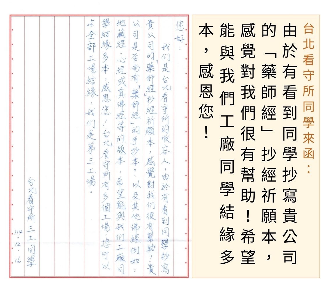 監獄同學來函:有看到同學抄寫貴公司的「藥師經」抄經祈願本,感覺對我們很有幫助,希望能與我們工廠同學結緣多本,感恩您!